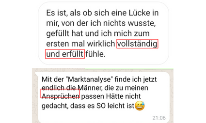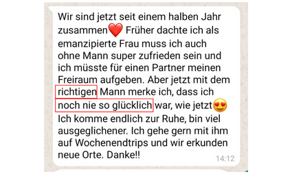 Die Bindungswunsch-Methode ist ein Online-Kurs für Single-Frauen, die nicht mehr allein sie wollen. Sie erlangen mit ihm Kontrolle beim Männerkennenlernen, sodass Sie in Rekordzeit einen sie schätzenden und liebenden Lebenspartner finden, der zu Ihren Werten & Vorstellungen passt.