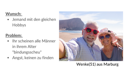 Die Bindungswunsch-Methode ist ein Online-Kurs für Single-Frauen, die nicht mehr allein sie wollen. Sie erlangen mit ihm Kontrolle beim Männerkennenlernen, sodass Sie in Rekordzeit einen sie schätzenden und liebenden Lebenspartner finden, der zu Ihren Werten & Vorstellungen passt.
